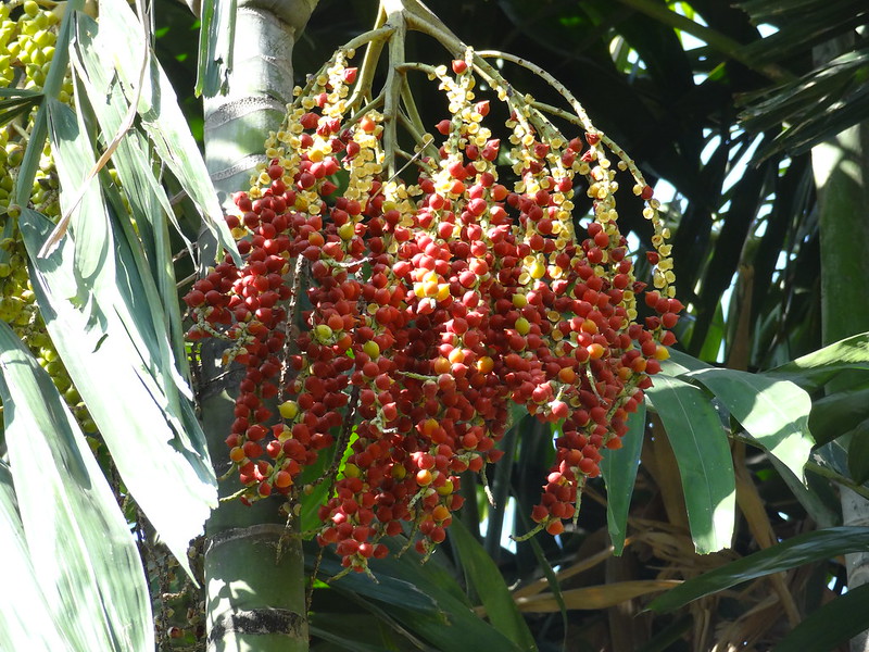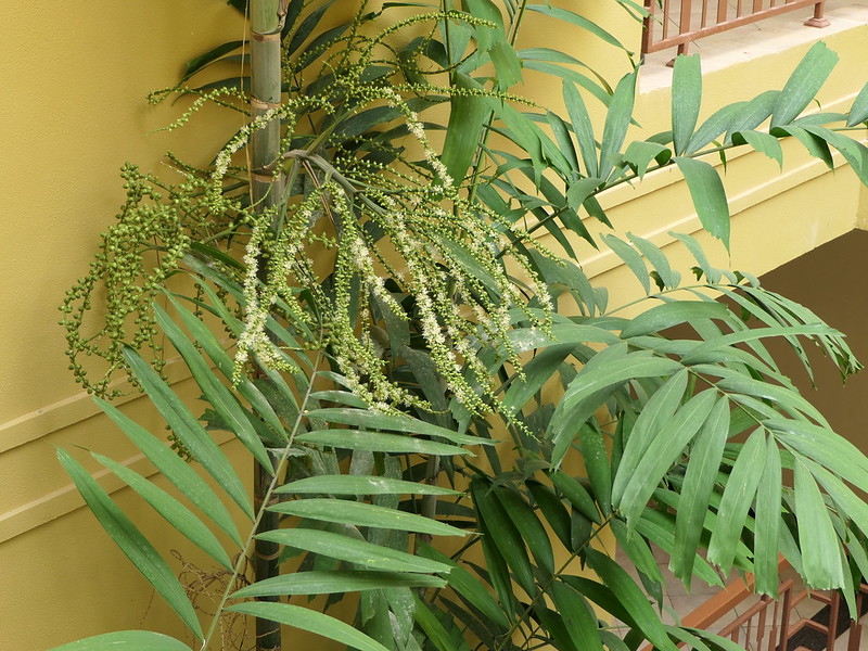 ดอก ช่อดอกแยกเพศอยู่ร่วมต้น ออกใต้คอ ดอกสีเหลืองอมเขียว ออกเป็นช่อแบบช่อแยกแขนงใต้โคนกาบใบ ดอกแยกเพศอยู่ร่วมต้น ช่อแผ่กระจาย ช่อดอกยาวประมาณ 30 เซนติเมตร