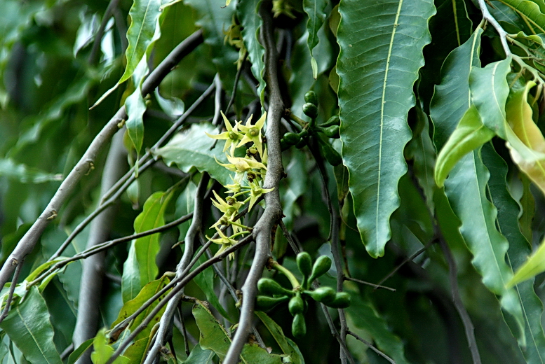 ดอก สีเขียวอ่อน มีกลิ่นหอม ออกเป็นช่อแบบช่อกระจุกที่กิ่งแก่ ช่อดอกห้อย ดอกย่อยขนาดเล็ก เส้นผ่านศูนย์กลาง 3-3.5 ซม. ก้านดอกยาว 2-3 ซม. กลีบเลี้ยง 3 กลีบ รูปสามเหลี่ยม กลีบดอก 6 กลีบ รูปใบหอก ปลายแหลมบิดโค้ง ขอบเป็นคลื่น กลีบเรียงสลับกัน 2 ชั้น กลีบชั้นนอกแคบและสั้นกว่าเล็กน้อย เกสรเพศผู้จำนวนมาก ออกดอก เดือน ม.ค.-มี.ค.