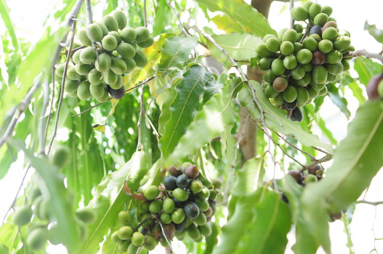 ผล ผลสดแบบผลกลุ่ม รูปไข่กลับ กว้าง 1.5-2 ซม. ยาว 2-2.5 ซม. สีเขียว เรียงอยู่บนแกนตุ้มกลม 5-12 ผล เมื่อสุกสีดำ เมล็ดมีเนื้อเยื่อห่อหุ้มบางๆ เมล็ดสีน้ำตาลอ่อน 1 เมล็ดต่อผล ติดผลเดือนก.พ.-มิ.ย.