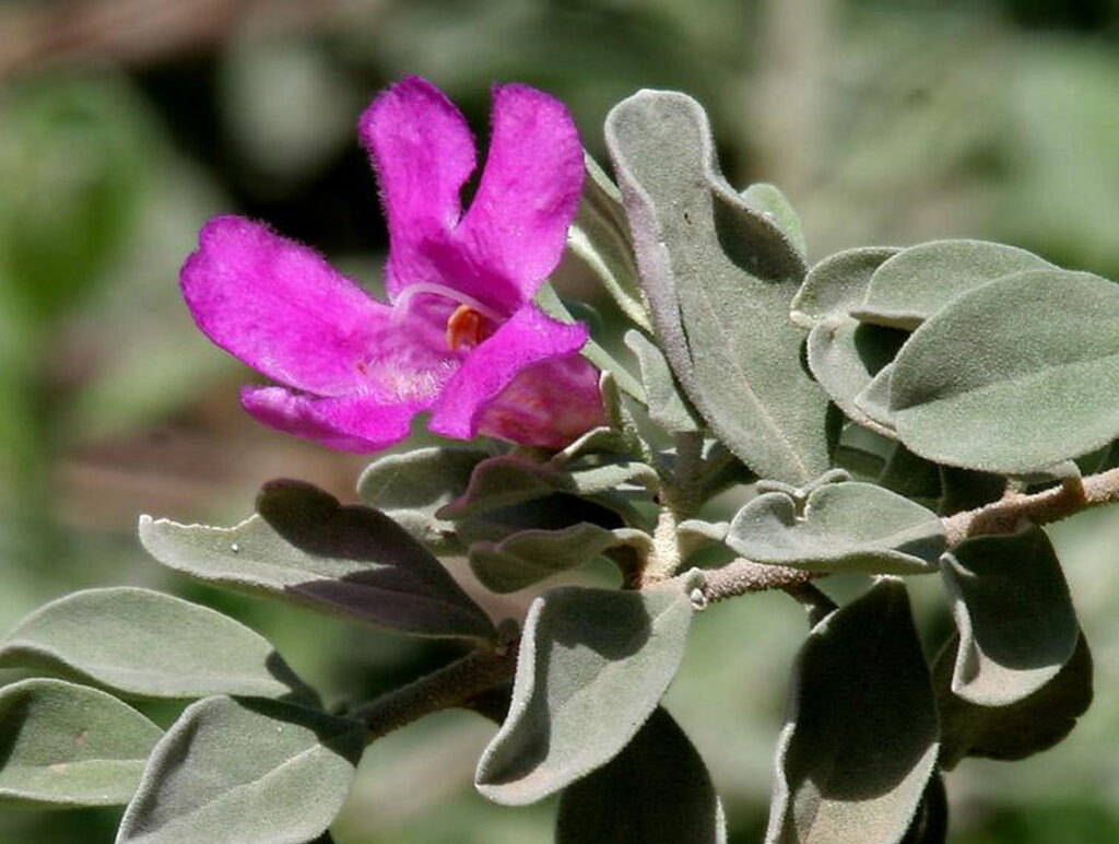 ไม้พุ่ม กิ่งมีขนสั้นนุ่ม ใบเรียงเวียนหรือเกือบตรงข้าม รูปไข่กลับกว้างหรือแกมรูปขอบขนาน ยาว 1–3.5 ซม. แผ่นใบมีขนสั้นนุ่ม ด้านล่างสีเทาเงิน ด้านบนสีเขียวอ่อน ก้านใบยาว 1–2 มม. ช่อดอกออกสั้น ๆ ตามซอกใบ มีดอกเดียว ไม่มีใบประดับ กลีบเลี้ยงรูประฆัง มี 5 กลีบ แฉกลึกเกินกึ่งหนึ่ง รูปขอบขนานหรือรูปใบหอก ยาว 3–5 มม. ดอกรูประฆัง สีชมพูอมม่วง หลอดกลีบดอกไม่ชัดเจน ยาว 1.8–2.6 ซม. กลีบรูปปากเปิด มีขนสั้นนุ่ม กลีบบน 2 กลีบ กลีบล่าง 3 กลีบ ด้านในมีจุดสีน้ำตาลกระจาย เกสรเพศผู้ 4 อัน ติดใกล้โคนหลอดกลีบดอก รังไข่มี 2 ช่อง ยอดเกสรเพศเมียจัก 2 พู ผลแห้งแตก เป็นไม้ประดับทั่วไป ใบและกิ่งใช้รักษาโรคตับอักเสบ โดยการแช่อาบ
