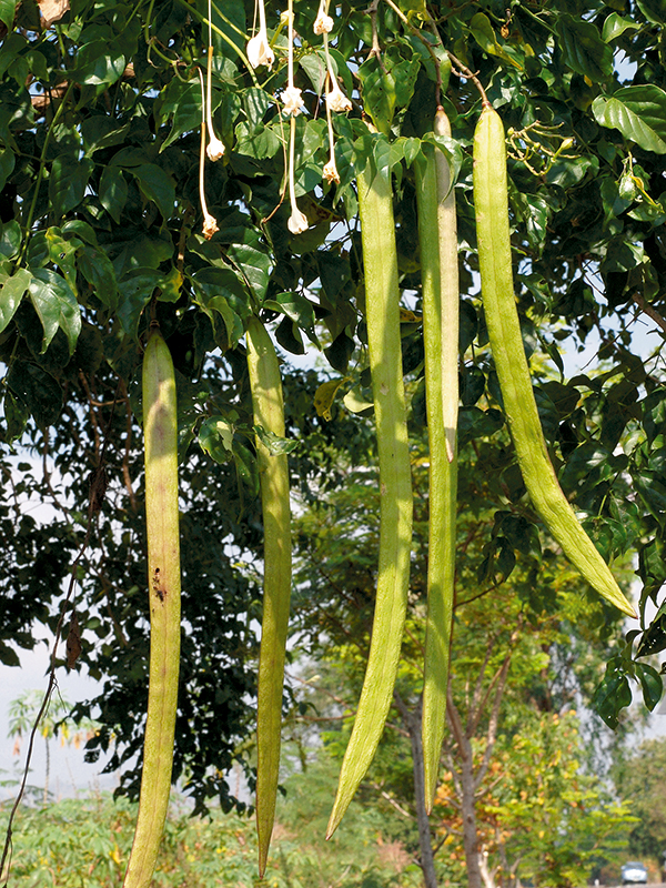 ไม้ต้น เปลือกเป็นคอร์ก ใบประกอบ 2–3 ชั้น ยาวได้ถึง 1 ม. ใบประกอบย่อยมี 3–5 คู่ ใบย่อยรูปรี รูปขอบขนาน หรือแกมรูปไข่ ยาว 2–7 ซม. โคนมนหรือกลม เบี้ยว ก้านใบสั้น ช่อดอกแบบช่อกระจุกแยกแขนงแผ่กว้าง ยาว 10–35 ซม. ดอกสีขาวมีกลิ่นหอม ก้านดอกยาวได้ถึง 1 ซม. กลีบเลี้ยงรูปถ้วย ยาว 2–4 มม. ปลายแยก 5 แฉกตื้น ๆ พับงอกลับ ดอกรูปดอกเข็ม หลอดกลีบดอกเรียวแคบ ยาว 3–7 ซม. ปากกว้าง 3–5 ซม. คล้ายรูปปากเปิด กลีบบน 2 กลีบ กลีบล่าง 3 กลีบ รูปใบหอกแกมรูปไข่ ยาว 1–2 ซม. ด้านในมีขน เกสรเพศผู้ 2 คู่ยาวไม่เท่ากัน ติดเหนือกึ่งกลางหลอดกลีบ อับเรณูสมบูรณ์หนึ่งอัน เป็นหมันหนึ่งอันคล้ายเดือย จานรองดอกรูปถ้วย รังไข่เกลี้ยง ผลแห้งแตก รูปแถบ แบน ยาว 28–36 ซม. เมล็ดรูปรีหรือขอบขนาน ยาว 1.5–3.5 ซม. รวมปีกบางใส