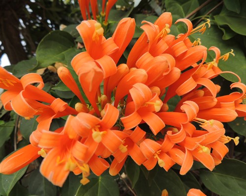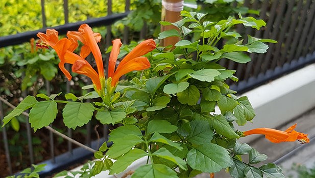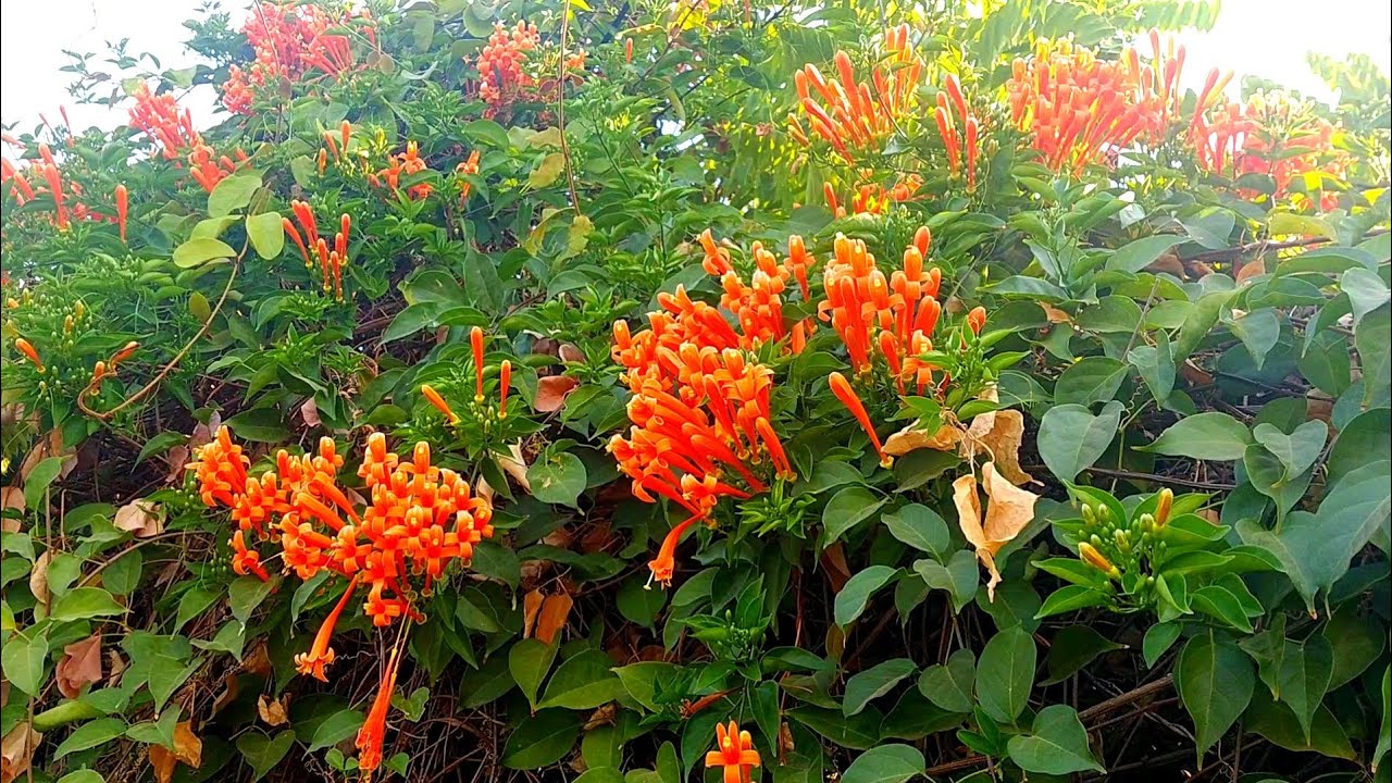 ไม้เถา ลักษณะไม้เลื้อยดอกสีส้มคล้ายไฟเป็นซุ้มหนาแน่น กิ่งเป็นเหลี่ยมเล็กน้อย ใบประกอบเรียงตรงข้าม มี 2–3 ใบย่อย ส่วนมากใบปลายเปลี่ยนรูปเป็นมือจับปลายแยก 3 ส่วน ใบย่อยรูปไข่ ยาว 5–8 ซม. ปลายแหลมยาว ก้านใบยาว 1–2 ซม. ช่อดอกแบบช่อกระจุกแยกแขนง ดอกจำนวนมาก กลีบเลี้ยงเชื่อมติดกันเป็นหลอด ปลายตัดหรือจักตื้น ๆ 5 แฉก ไม่ชัดเจน ขอบมีขนครุย ดอกรูปหลอด สีส้ม ขอบกลีบสีขาว หลอดกลีบดอกยาว 4–6 ซม. กลีบรูปขอบขนาน กลีบบน 2 กลีบ ยาวได้ถึง 1 ซม. กลีบล่าง 3 กลีบ พับงอกลับ ยาวกว่ากลีบบนเล็กน้อย เกสรเพศผู้ 4 อัน ยื่นพ้นปากหลอดกลีบเล็กน้อย รังไข่มี 4 สัน มี 2 ช่อง ยอดเกสรเพศเมียจัก 2 พู ผลแห้งแตก รูปแถบ แบน เมล็ดบาง มีปีกทั้งสองข้าง