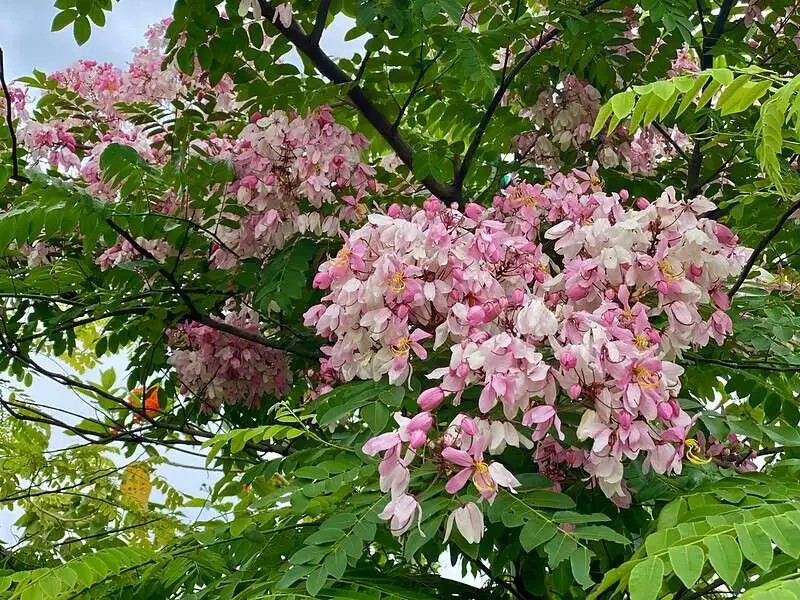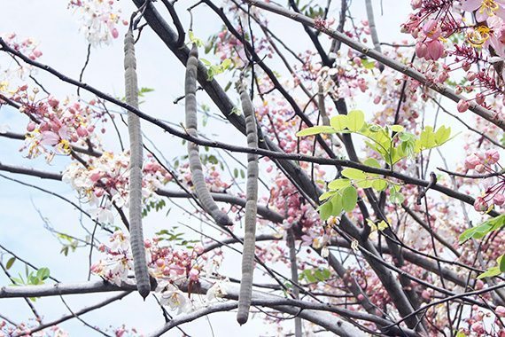 ไม้ต้น มีขนกิ่งตามกิ่งอ่อน แผ่นใบ ใบประดับ กลีบเลี้ยง และฝัก ใบประกอบยาว 15–40 ซม. มีใบย่อย 5–8 คู่ ใบย่อยรูปขอบขนานหรือรูปใบหอกกลับ ปลายกลมมีติ่งแหลม โคนกลม ก้านใบยาวประมาณ 2 มม. ช่อดอกแบบช่อกระจะ ยาว 5–12 ซม. ออกตามซอกใบที่หลุดร่วง ใบประดับและใบประดับย่อยสีแดงอมน้ำตาล กลีบเลี้ยงรูปใบหอกยาว 0.9–1.2 ซม. ดอกสีขาวอมชมพู กลีบรูปใบหอกแกมรูปไข่ ยาว 3.5–4.5 ซม. เกสรเพศผู้อันยาว 3 อัน โค้งงอ ก้านชูอับเรณูยาว 3.5–5 ซม. ป่องกลาง อันสั้น 4 อัน ก้านชูอับเรณูยาวประมาณกึ่งหนึ่งของอันยาว แต่อับเรณูยาวกว่าประมาณ 2 เท่า 3 อันลดรูป ยาว 1–1.5 ซม. อับเรณูขนาดเล็ก รังไข่ยาวประมาณ 4 ซม. ก้านยาว 1–1.5 ซม. ฝักยาว 30–40 ซม. มี 30–40 เมล็ด (ดูข้อมูลเพิ่มเติมที ราชพฤกษ์,สกุล)