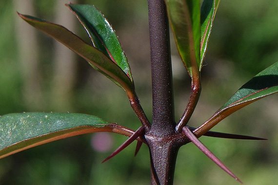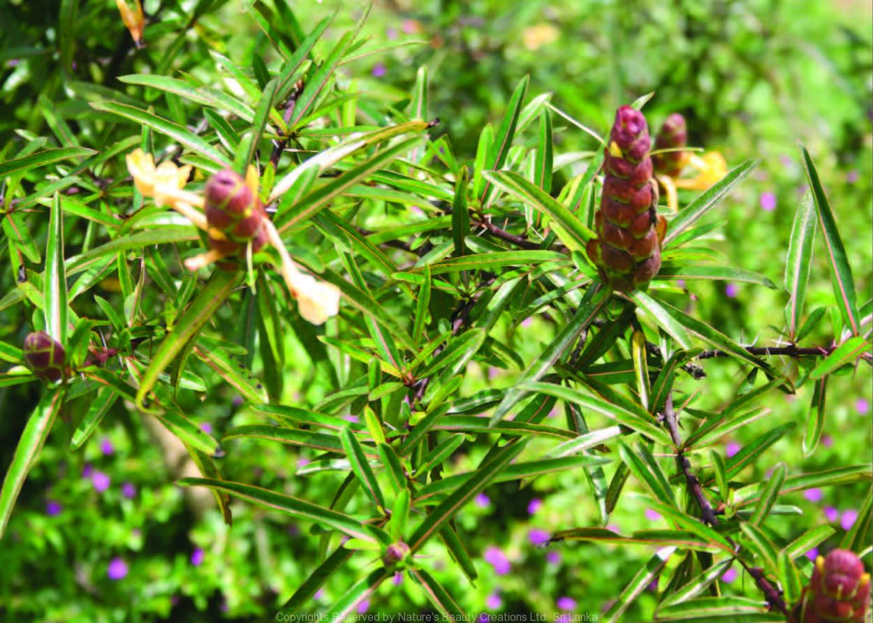ไม้พุ่ม ใบเรียงตรงข้ามสลับตั้งฉากชิดกันใกล้ช่อดอก รูปใบหอก ยาว 4–10 ซม. ปลายแหลมเป็นติ่ง โคนสอบเรียว แผ่นใบเกลี้ยงสีเขียวเข้มหรืออมม่วง เส้นกลางใบมักมีสีแดงหรืออมชมพู ก้านใบสั้น มีหนามที่โคนหนึ่งคู่ โค้งงอ ยาว 1–2 ซม. มีหนามสั้น ๆ ตรง 1 อัน ช่อดอกแบบช่อเชิงลด ออกตามปลายกิ่ง ยาว 8–10 ซม. ใบประดับสีน้ำตาลอมม่วง โคนสีเขียว หรือทั้งใบสีแดงอมเขียวหรือม่วงอมน้ำตาล รูปไข่กว้าง ยาวได้ถึง 1.5 ซม. ปลายเป็นติ่งแหลม กลีบเลี้ยงยาว 0.8–1 ซม. คู่นอกขนาดใหญ่กว่าคู่ใน ปลายมีติ่งหนาม ดอกสีส้มหรือเหลือง หลอดกลีบดอกยาวประมาณ 3 ซม. กลีบบน 4 กลีบ เรียงซ้อนแผ่ชิดกัน ยาว 1–2 ซม. กลีบล่างขนาดเล็ก พับงอเล็กน้อย เกสรเพศผู้ 2 อัน ยาวประมาณ 2 ซม. ยื่นพ้นปากหลอดกลีบดอก เกสรเพศผู้ที่เป็นหมัน 2 อัน ก้านเกสรเพศเมียยาวประมาณ 3 ซม. ผลรูปไข่หรือแกมรูปขอบขนาน แบน ยาวประมาณ 1.5 ซม. มี 2 ซีก แต่ละซีก มี 1–2 เม็ด