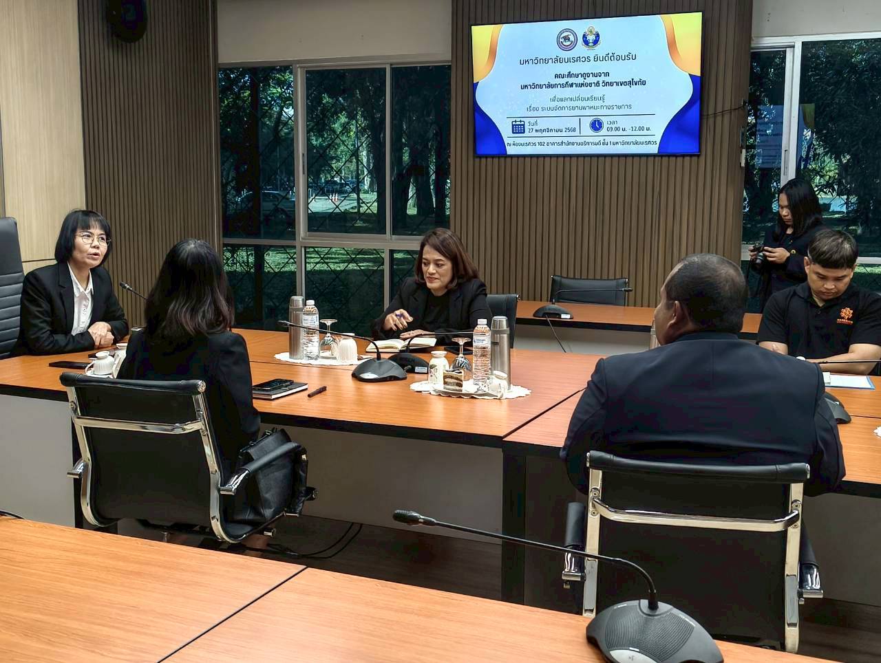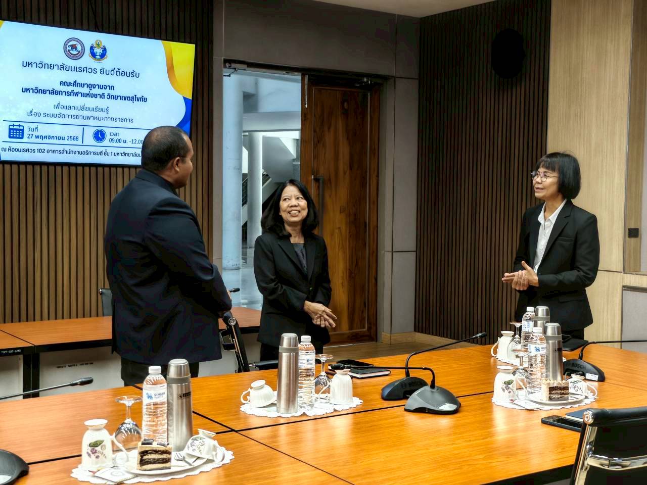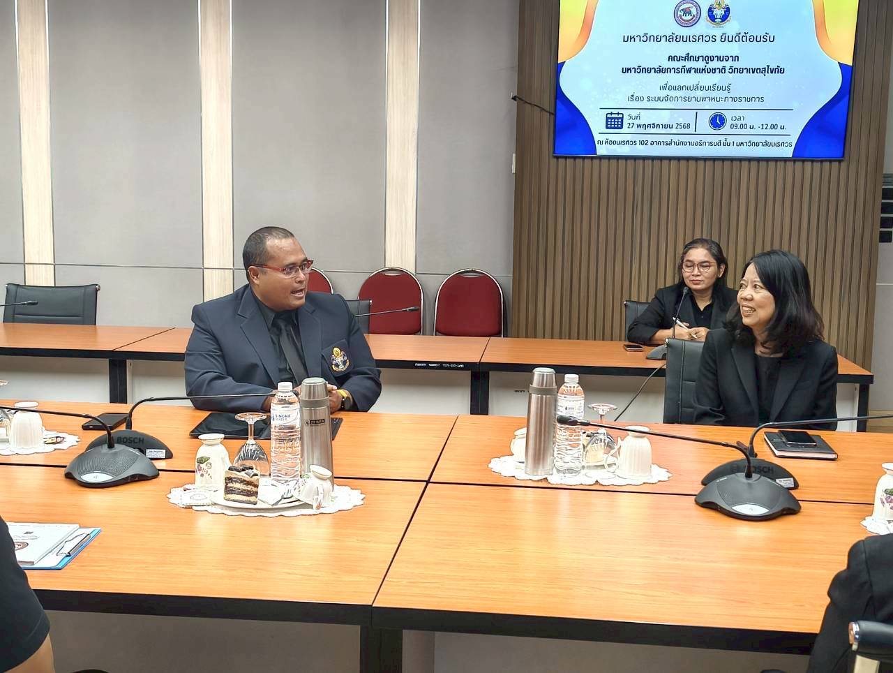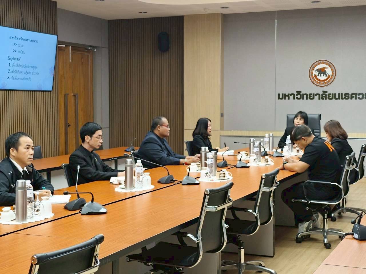 เมื่อวันที่ 27 พฤศจิกายน 2568 ณ ห้องประชุม 102 อาคารสำนักงานอธิการบดี มหาวิทยาลัยนเรศวร นางศิริมาศ เสนารักษ์ ผู้อำนวยการกองกลาง พร้อมด้วยนางปัญฑิตา รอดมา รักษาการหัวหน้างานพิธีการและกิจการพิเศษ กองกลาง มหาวิทยาลัยนเรศวร และบุคลากรหน่วยยานพาหนะ ให้การต้อนรับผู้บริหารและบุคลากรจากมหาวิทยาลัยการกีฬาแห่งชาติ วิทยาเขตสุโขทัย นำโดย ผศ.สิริพร มีผดุง รองอธิการบดีประจำวิทยาเขตสุโขทัย ที่มาศึกษาดูงานเกี่ยวกับระบบบริหารจัดการยานพาหนะทางราชการ เพื่อพัฒนาระบบบริหารจัดการยานพาหนะของวิทยาเขตให้มีประสิทธิภาพ พร้อมกันนี้ได้เยี่ยมชมพิพิธภัณฑ์ผ้า มหาวิทยาลัยนเรศวรอีกด้วย